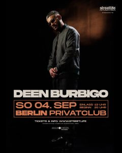 Der Rapper Deen Burbigo meldete sich letzten Sommer mit der EP OG SAN zurück und zeigte einmal mehr seinen unverkennbaren Stil. Für ein exklusives Deutschlandkonzert kommt der französische Musiker am 4. September nach Berlin. Gewinne hier Freikarten und erlebe den einzigartigen Mix aus melodischen Beats und seinem unverkennbaren Rap-Stil live.